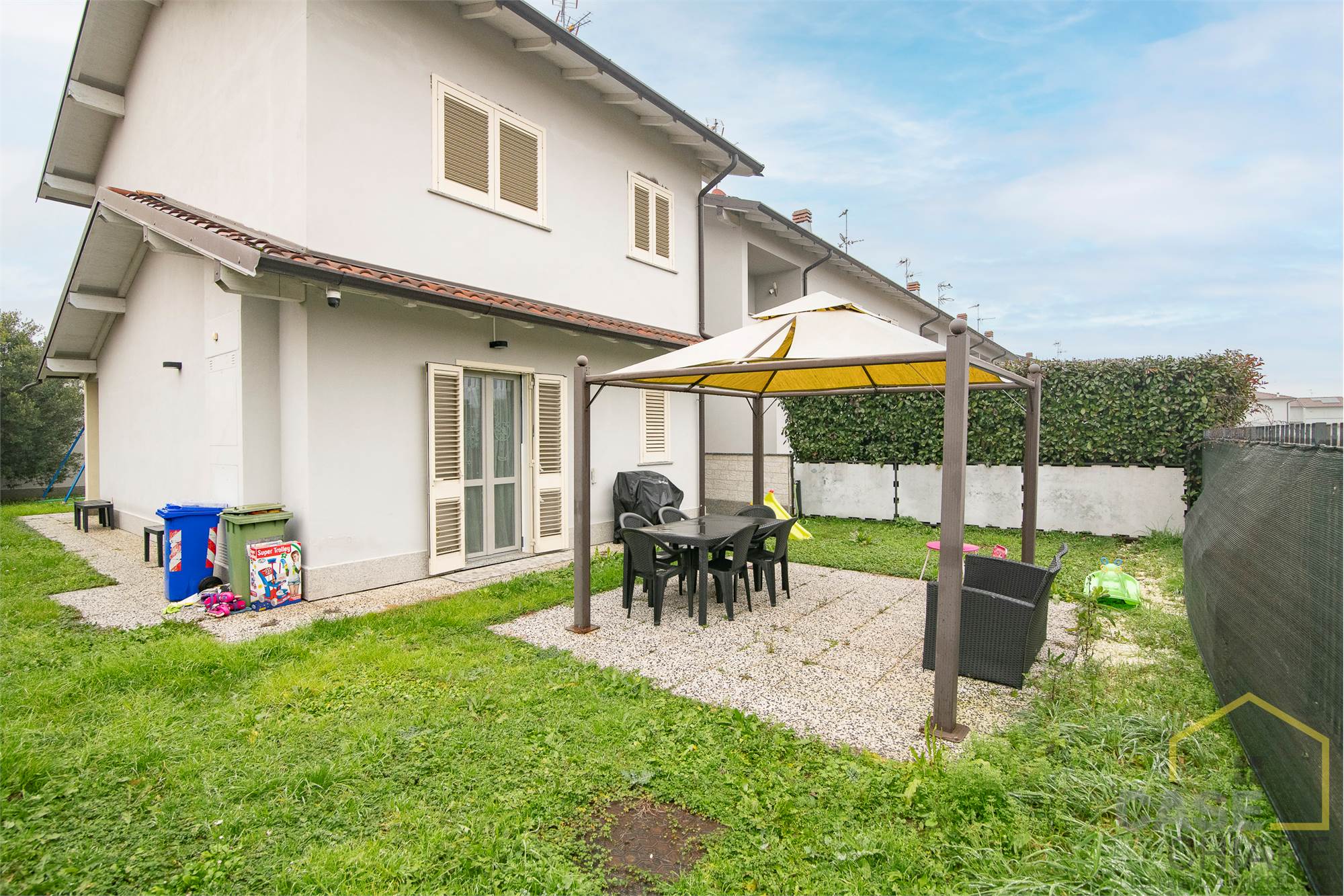 La zona esterna vanta un comodo portico e un giardino privato ideale per momenti di relax all’aperto.