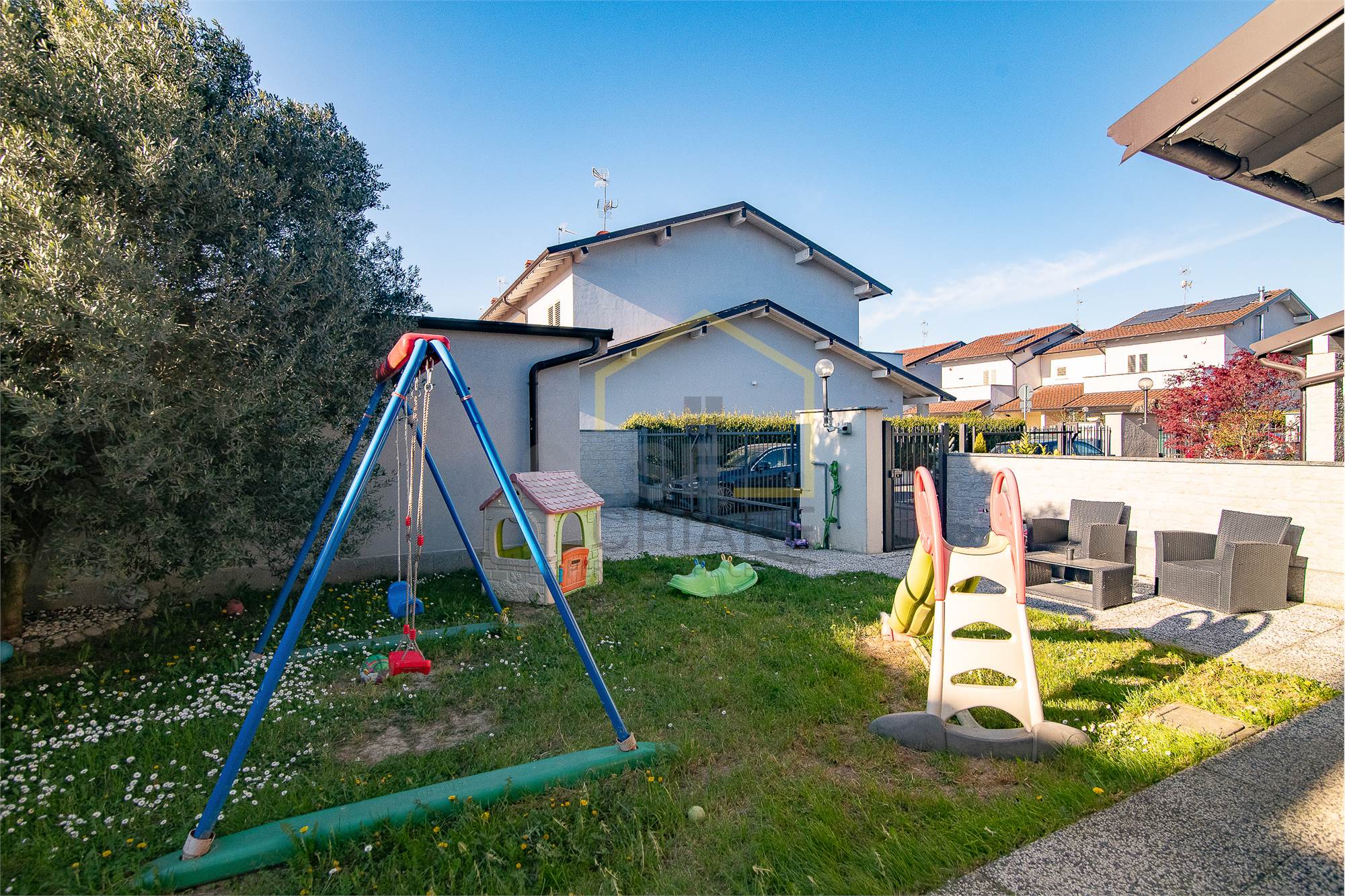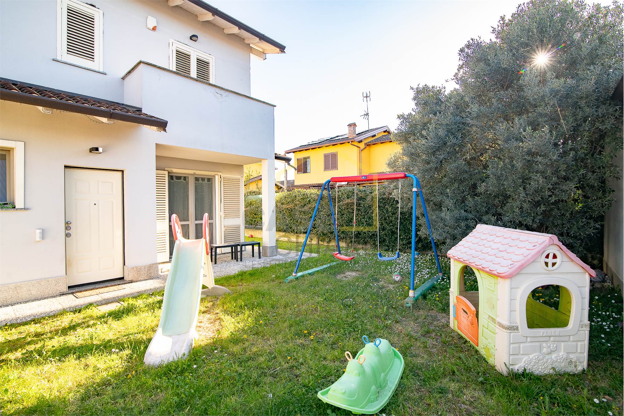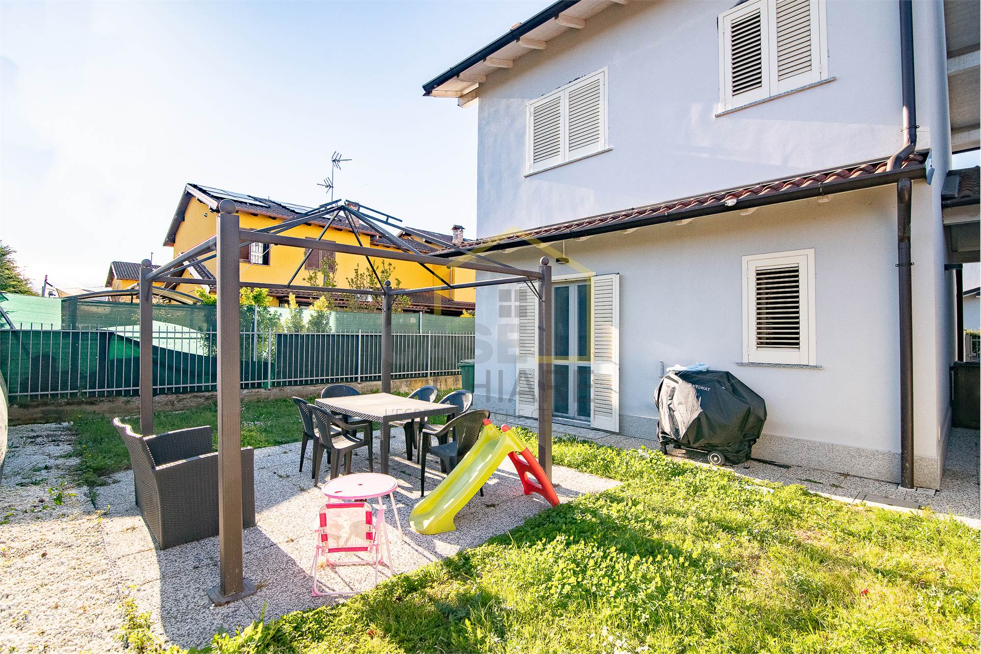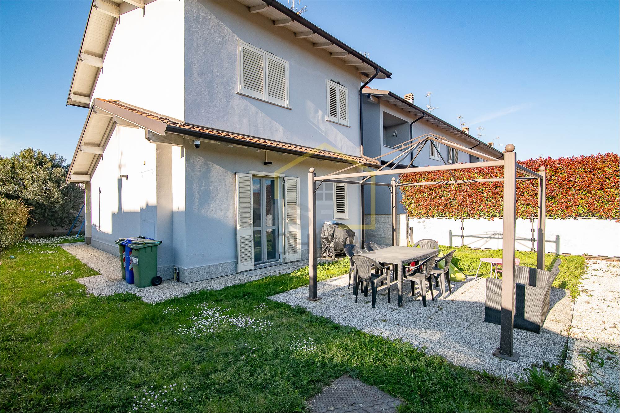 La zona esterna vanta un comodo portico e un giardino su tre lati ideale per momenti di relax all’aperto.